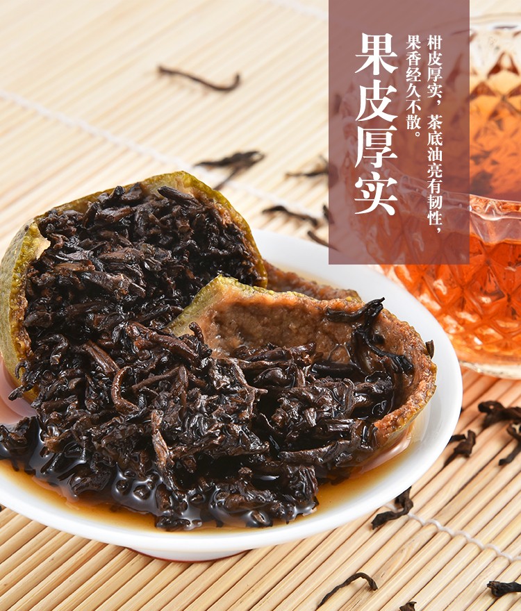 理气健胃,祛痰润喉。小青柑,果小、皮青、柑质青涩,挥发油含量多,陈皮中的苦味源于挥发油中的柠苦素,具有化痰、润肺、理气的功效,同时还有消积化滞、健胃、保护心血管等功效。